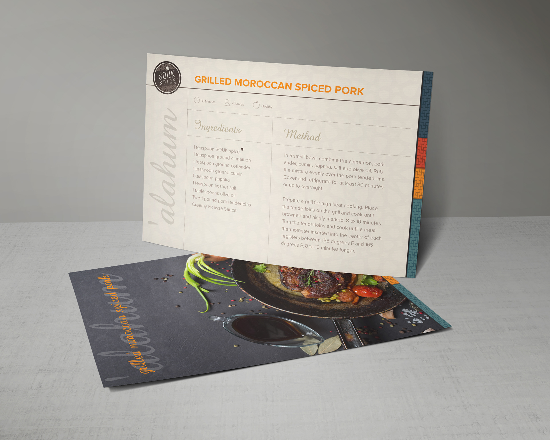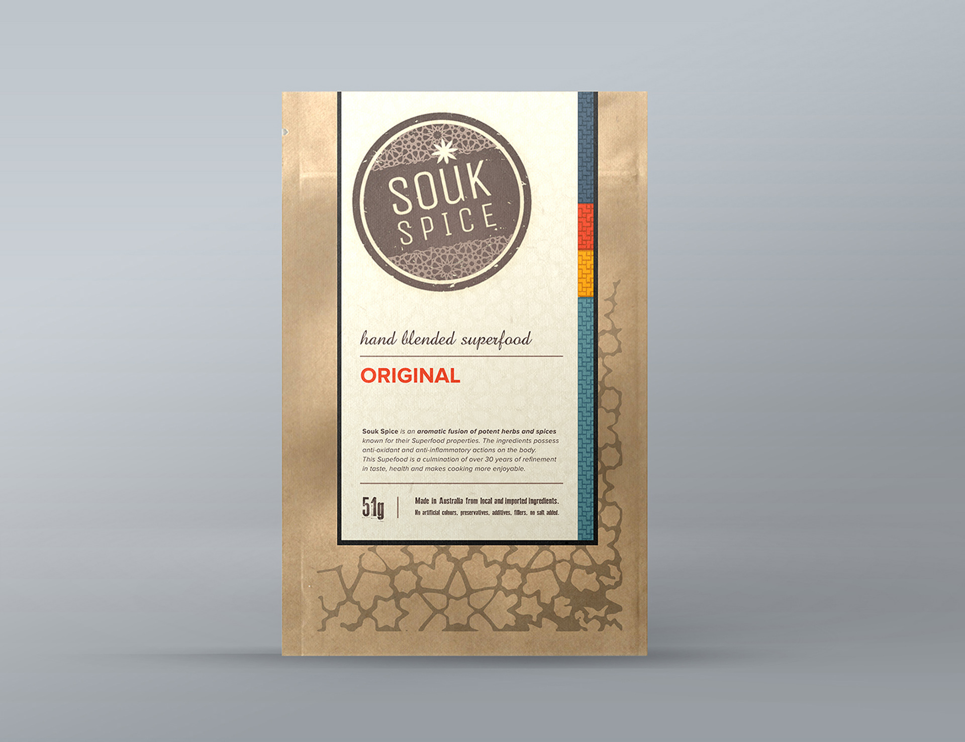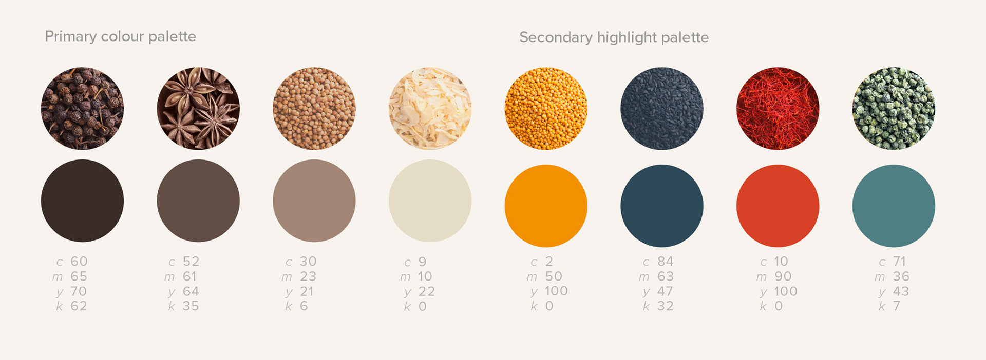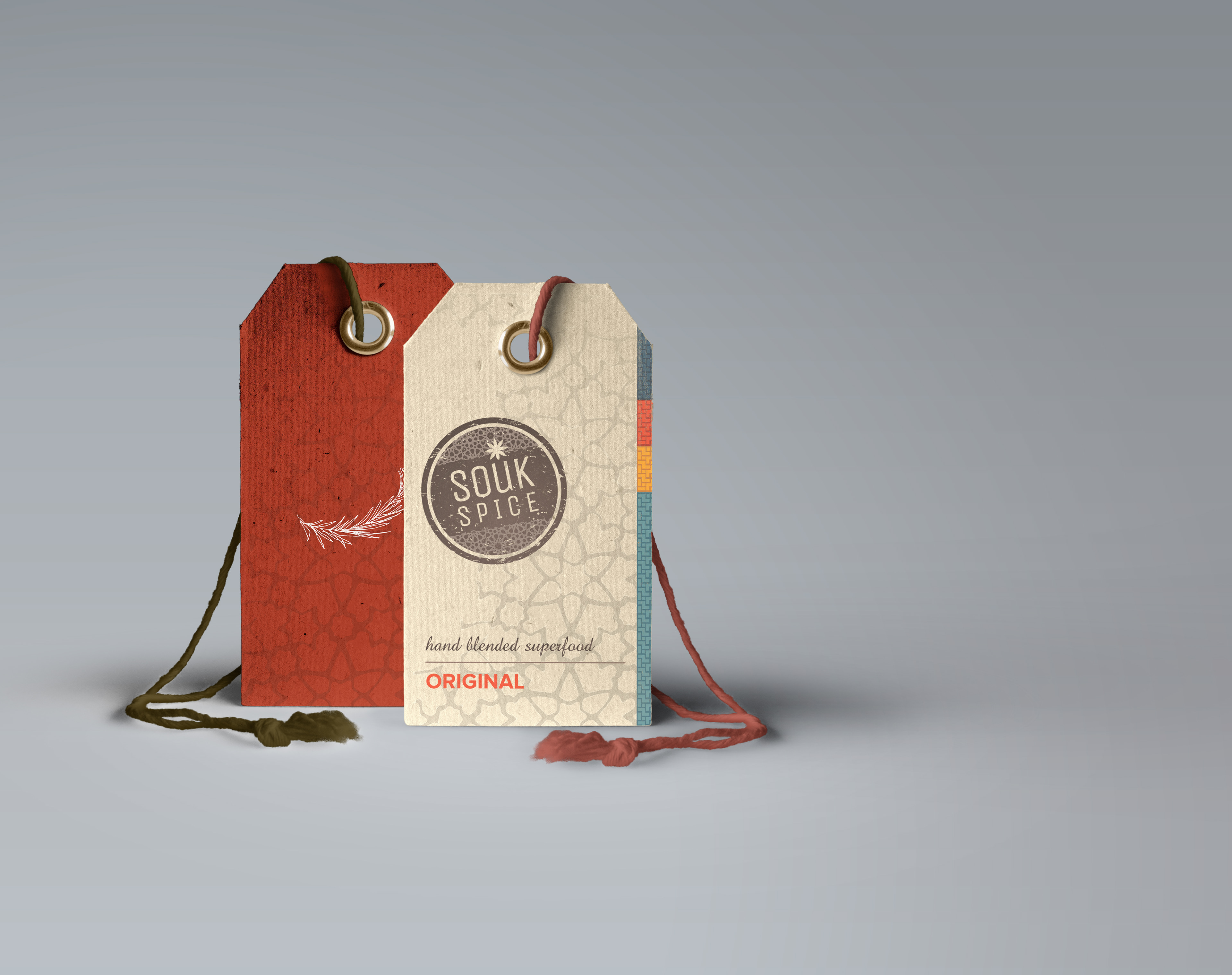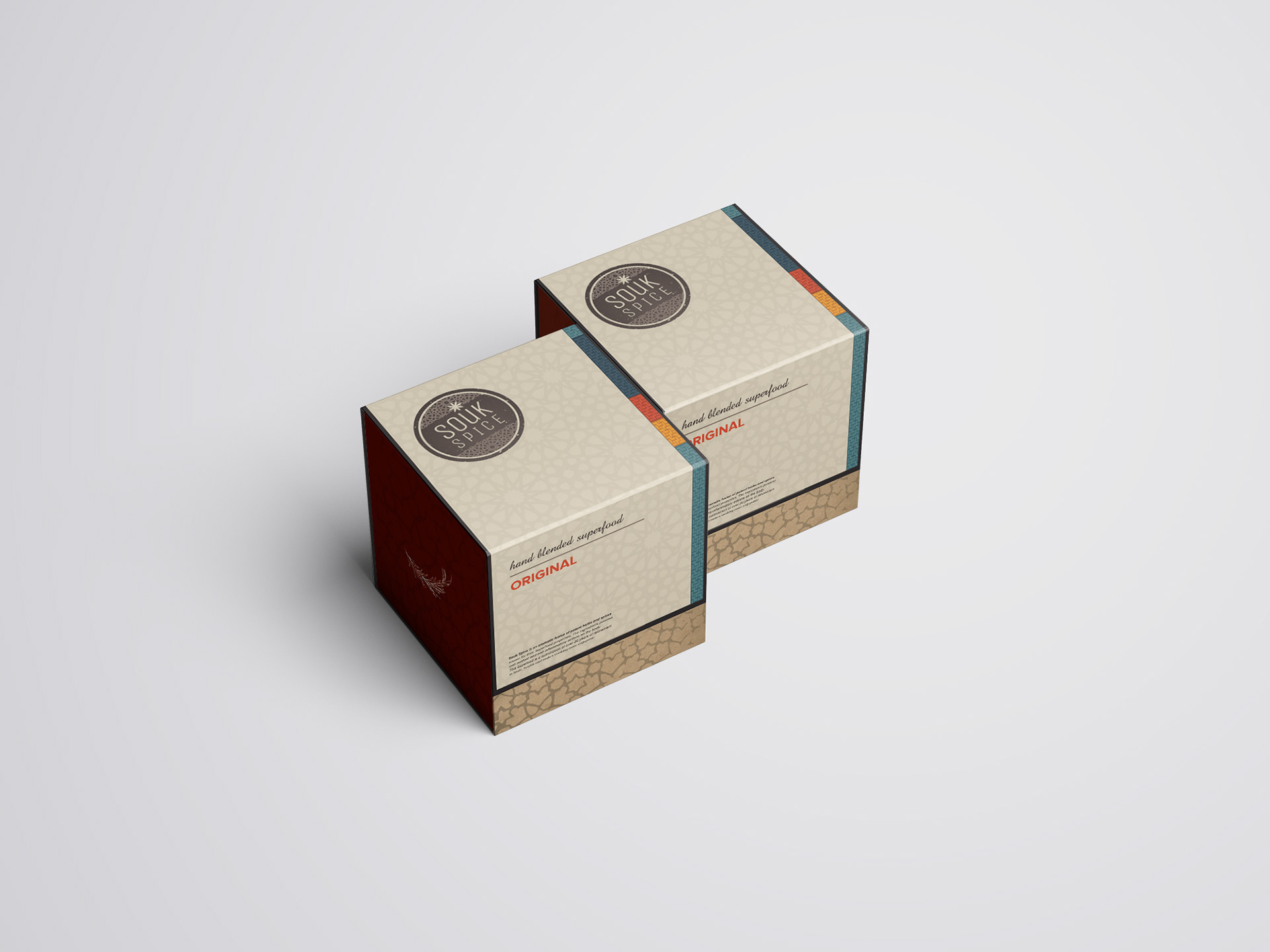 Branding and packaging mockups for Arabic Spice mix. Arabic spice markets the inspiration for the neutral tones, detailed patterns and vibrant pops of color.