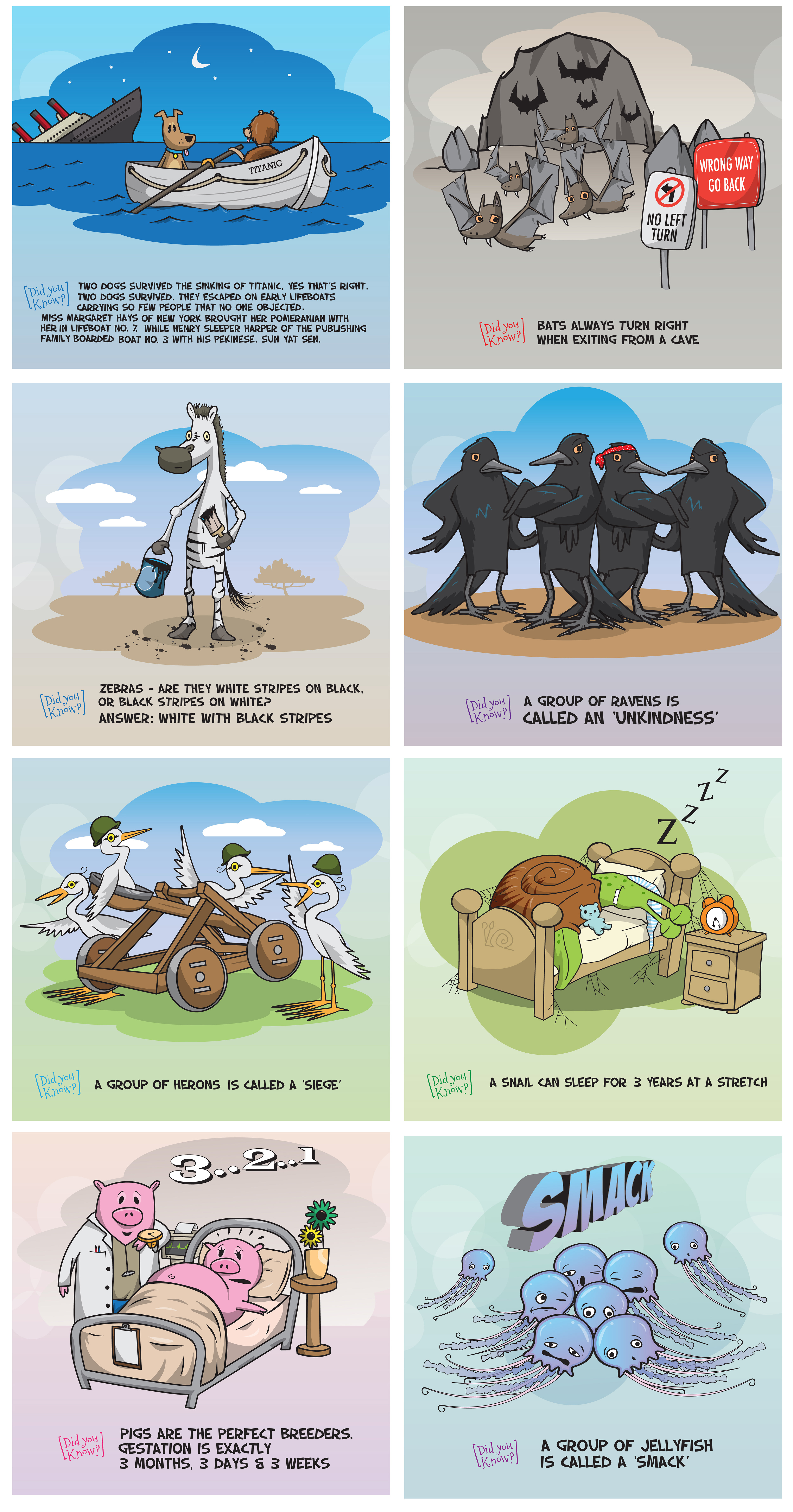 Some illustrations created for a television program 'Talk to the Animals' produced by WTFN. A series as small 'Fast facts' which will be animated and used as transitions between stories. Each illustration has been created in multiple layers according to depth with each layer illustrated in full to assist animation during production,
