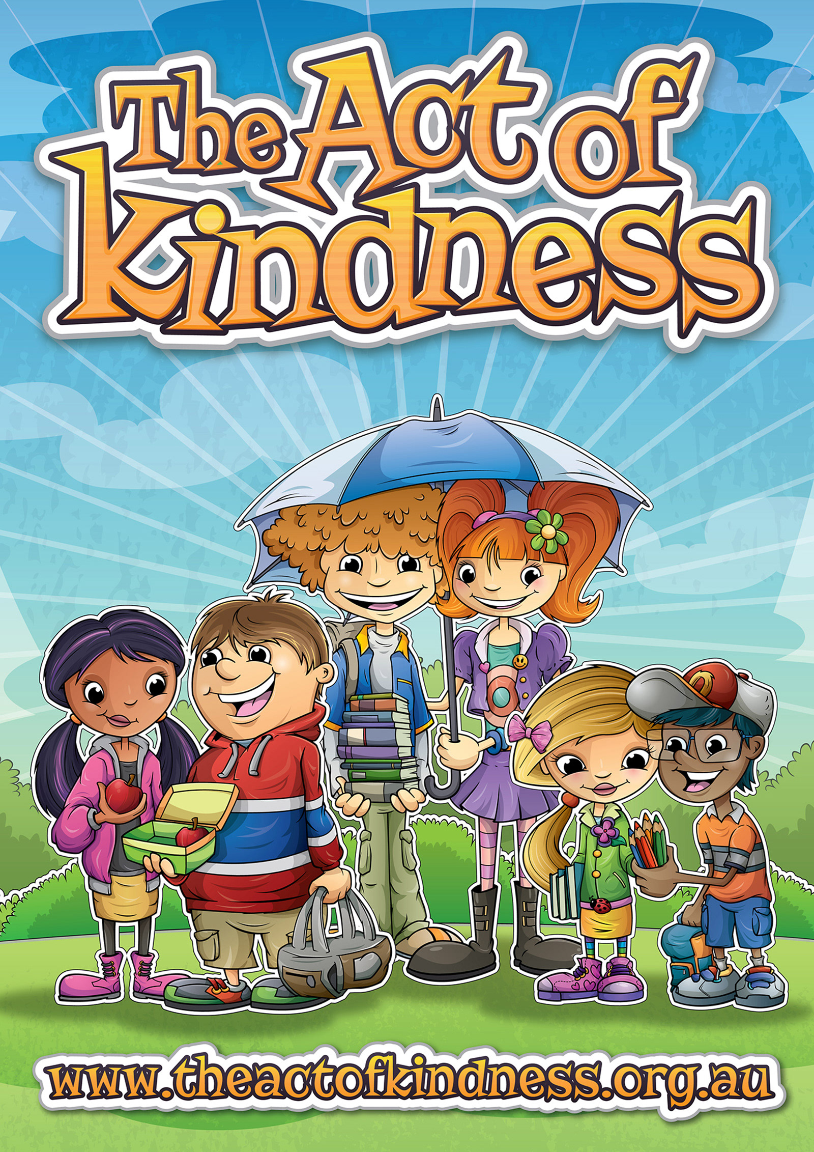 Character design and illustration for Primary school children. The Act of Kindness builds strong values and friendships by recognising and rewarding acts of generosity, compassion, kindness at all levels. Each pairing of children represents a block of age groups. All 6 come together to represent the overall program.